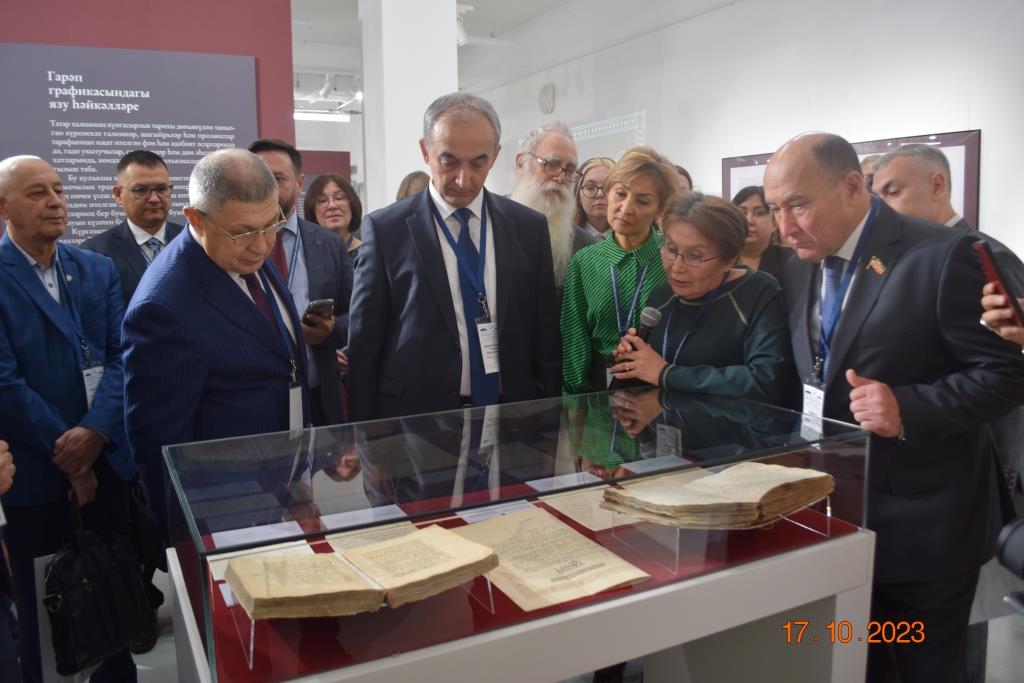 На выставке «История письма европейской и восточной цивилизации», торжественное открытие которой предшествовало пленарному заседанию конференции, были представлены памятники деловой и книжной письменности России и стран Западной Европы XV–нач. XIX в., арабографические рукописные документы светского и религиозного характера XIII – нач. XIX вв., раритеты нумизматики и эпиграфики, хранящиеся в Научно-историческом архиве СПбИИ РАН, Центре письменного наследия Института языка, литературы и искусства им. Г. Ибрагимова АН РТ, Институте археологии им. А. Халикова АН РТ, Национальной библиотеке РТ.